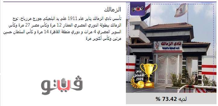 فاز نادى "الزمالك" بلقب أفضل نادى فى استفتاء "فيتو" لاختيار الأفضل فى عام 2020.