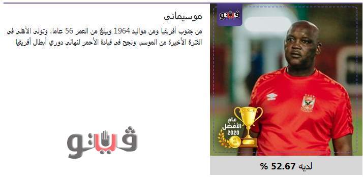 وحصل موسيماني على نسبة 52.54%، من أصوات الجمهور، يليه باتشيكو بنسبة 33.62%، وعماد النحاس 5.25%، وفايلر 4.29%، وكارتيرون 4.13%، وحسام البدري 0.16%.