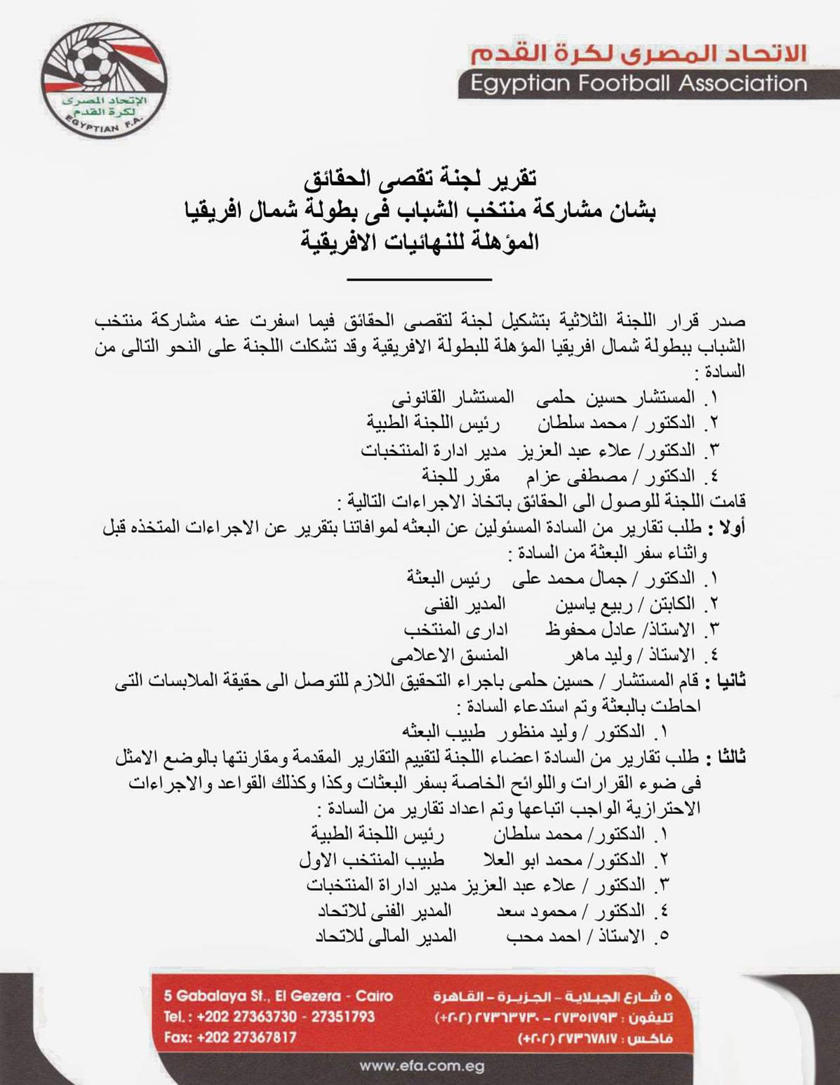 أصدرت لجنة تقصى الحقائق توصيات في أزمة منتخب الشباب في دورة شمال أفريقيا فى تونس.