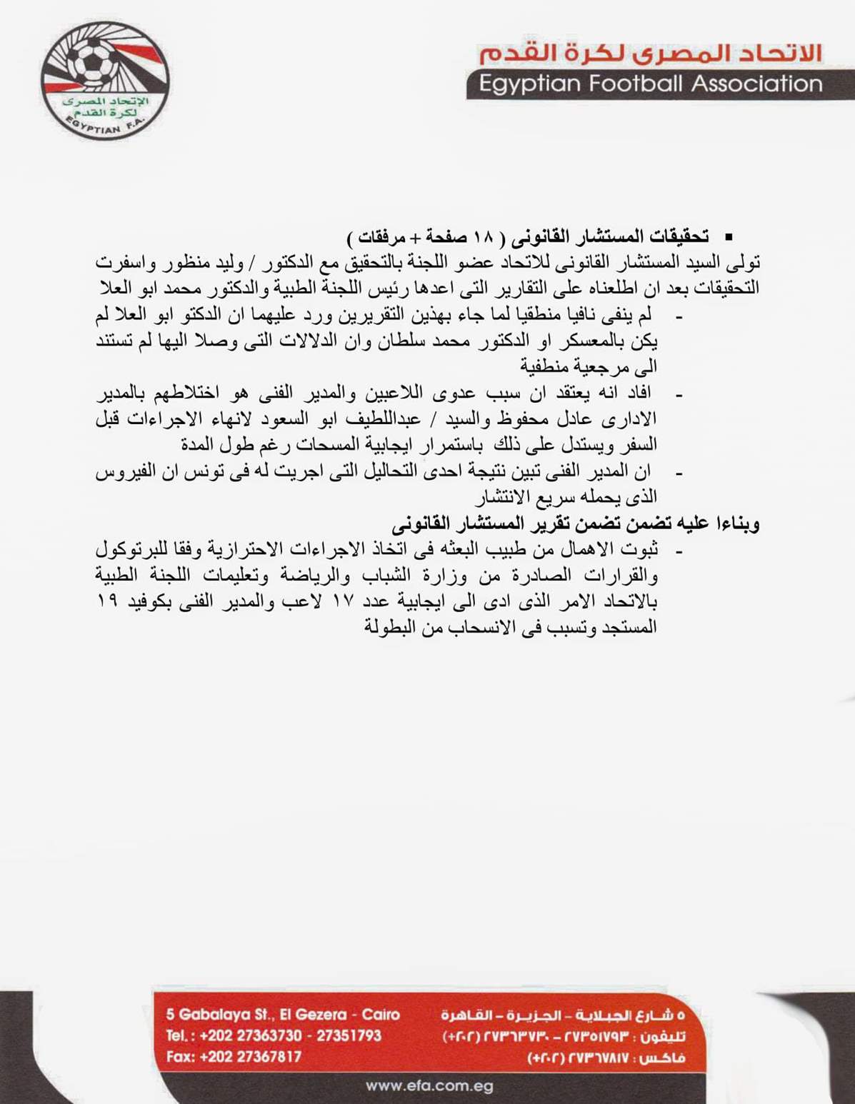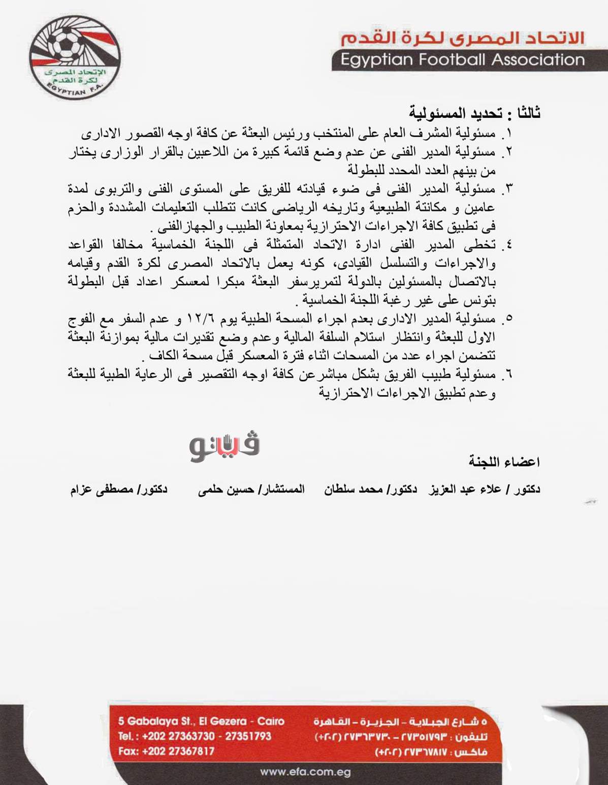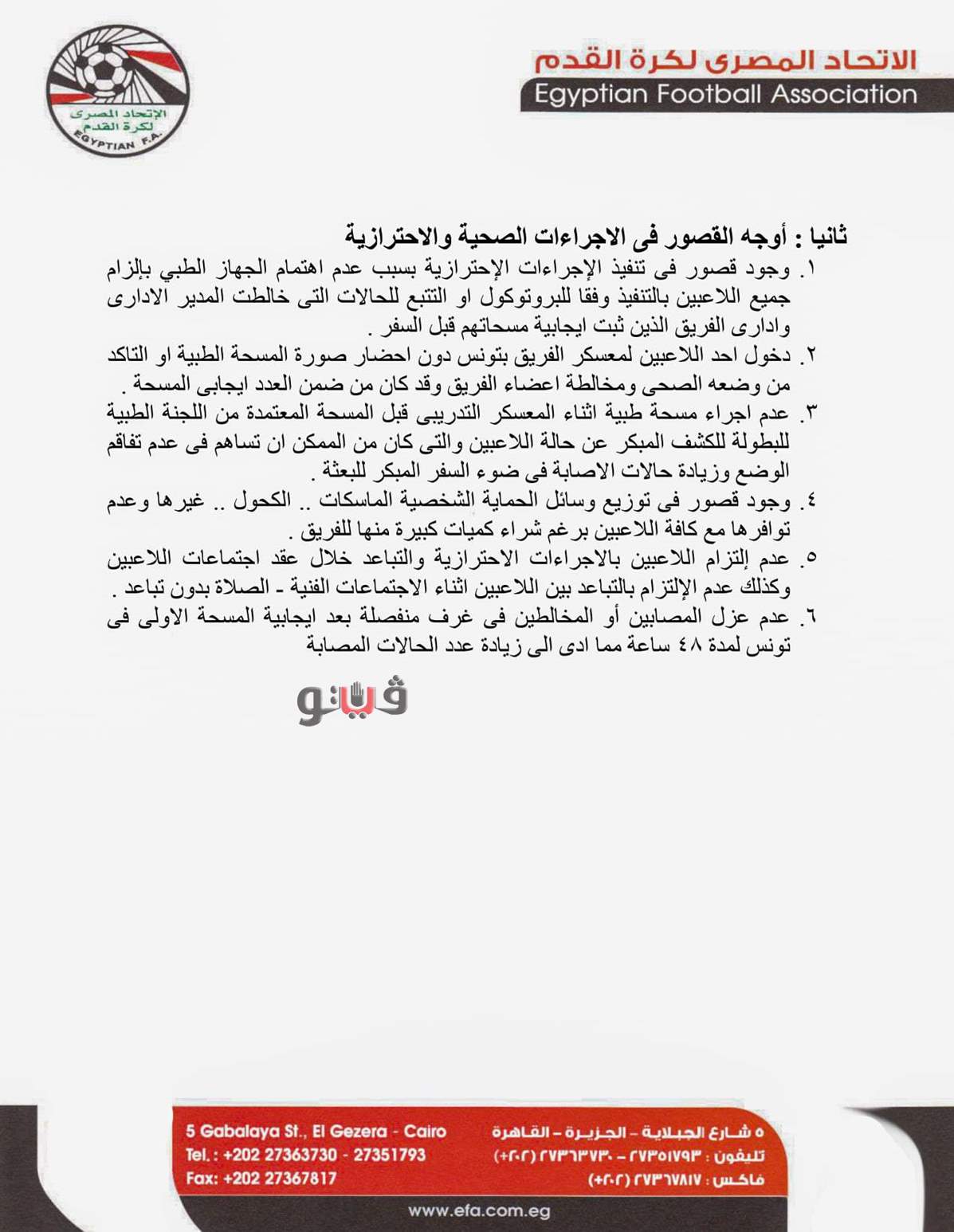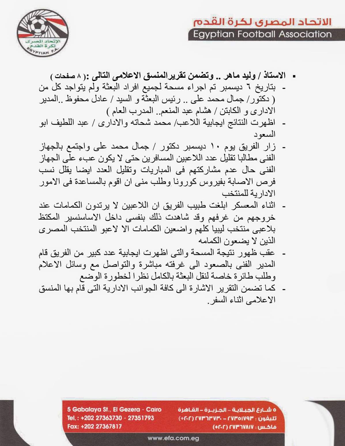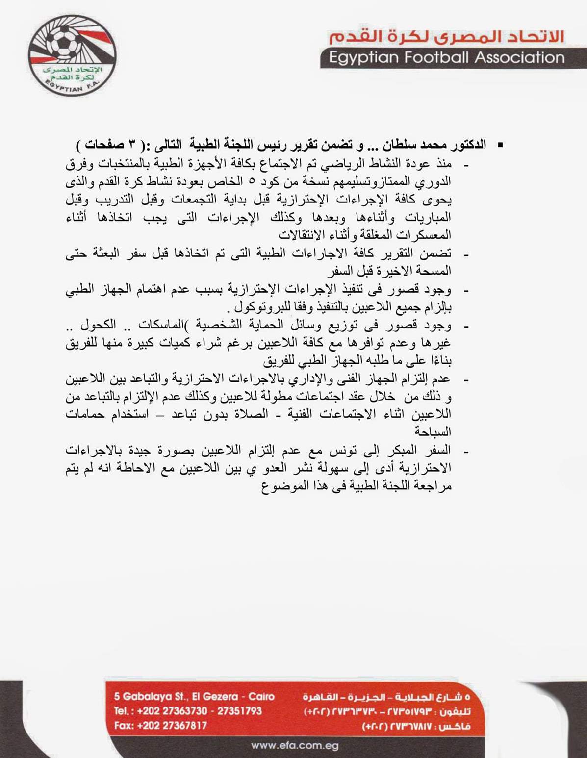 وأكد ربيع ياسين في تقريره أن طبيب المنتخب د.وليد منظور يتحمل مسئولية إصابات كورونا لانه لم يحرص على توعية اللاعبين.