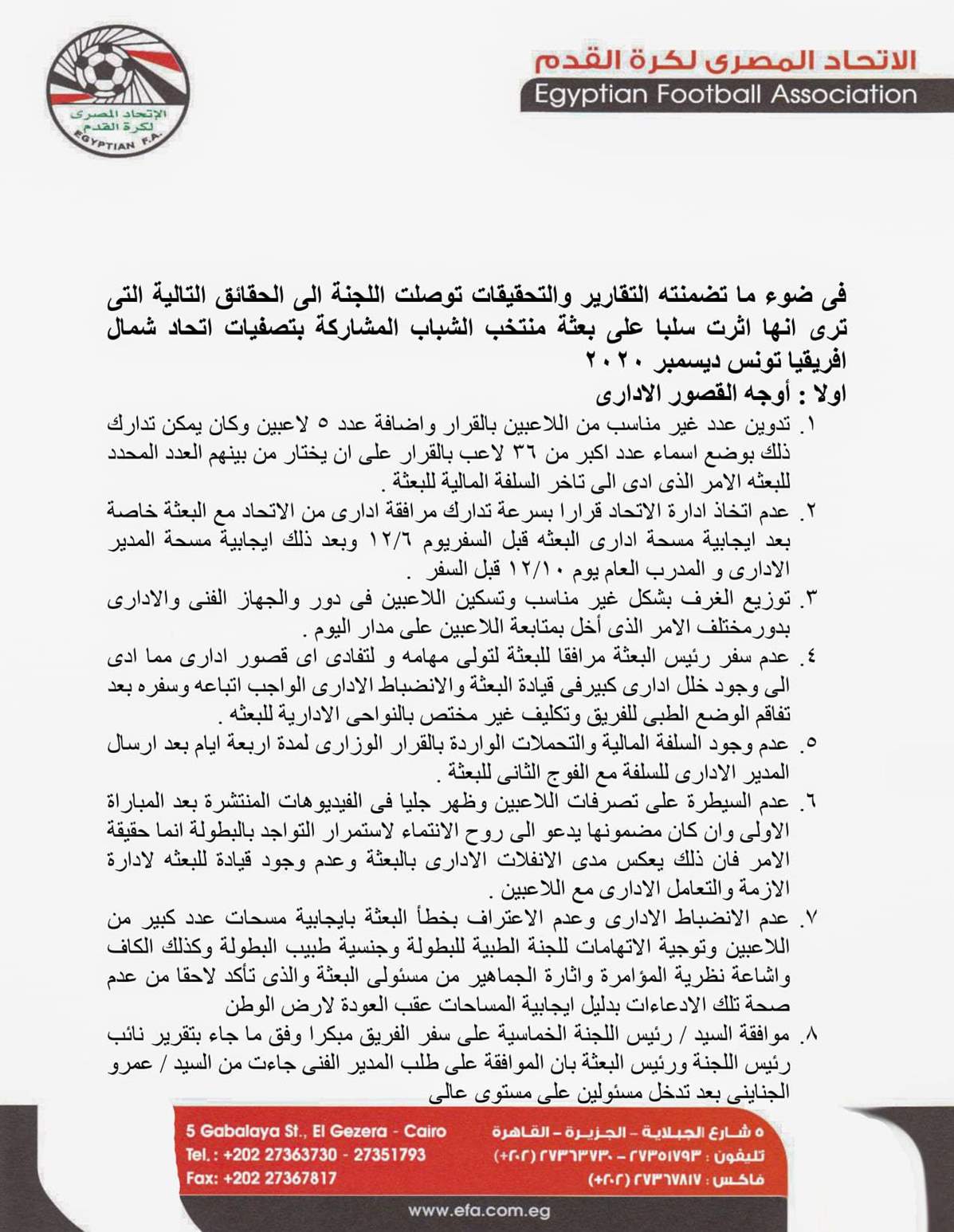 نوه إلى أن هناك قصور ادارى فى رحلة تونس نظرا لعدم وجود مدير ادارى مع البعثة لمنتخب الشباب مع عدم التزام اللاعبين بالاجراءات الاحترازية مشيرا إلى أن هناك أحد اللاعبين بالمنتخب سافر بدون عمل مسحة فيروس كورونا.