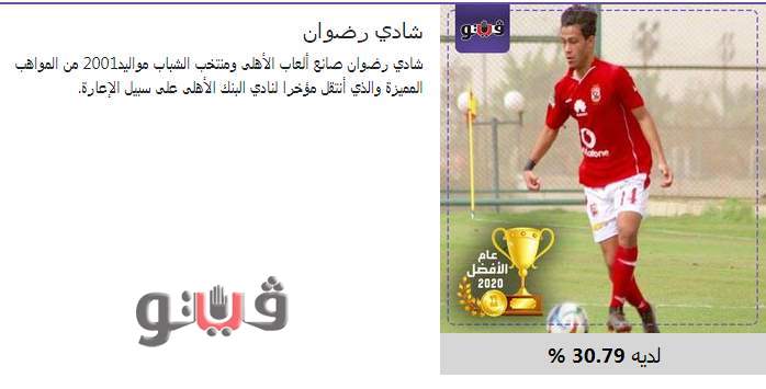 "شادي رضوان" يفوز بلقب أفضل لاعب صاعد في استفتاء "فيتو 2020"
