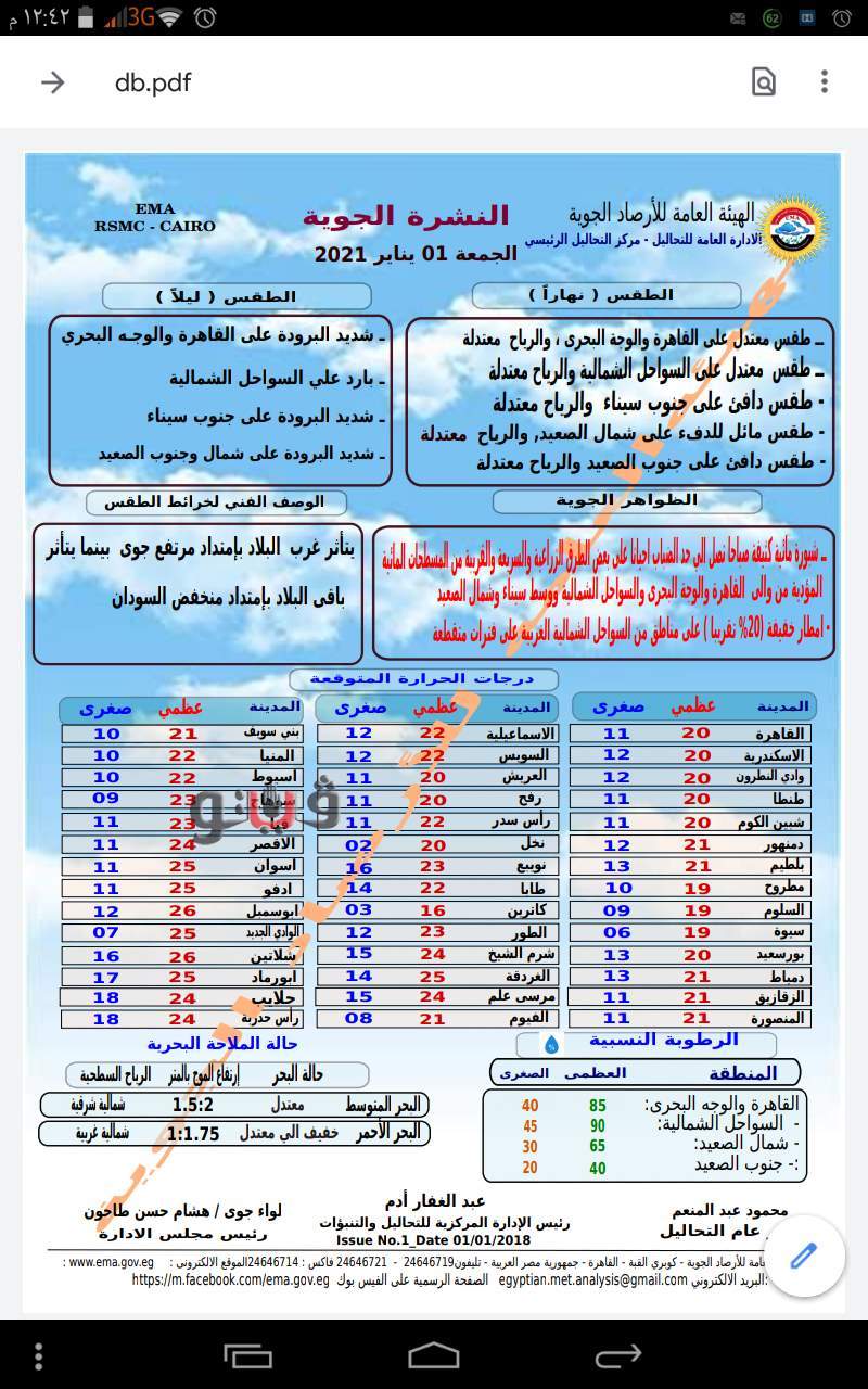 ومن المتوقع حدوث شبورة مائية صباحية على الطرق الزراعية والسريعة تكون كثيفة على القاهرة والوجه البحري وشمال الصعيد ومدن القناة وسيناء والسواحل الشمالية تصل لحد الضباب الأيام الآتية: الجمعة والسبت والأحد والإثنين والثلاثاء.