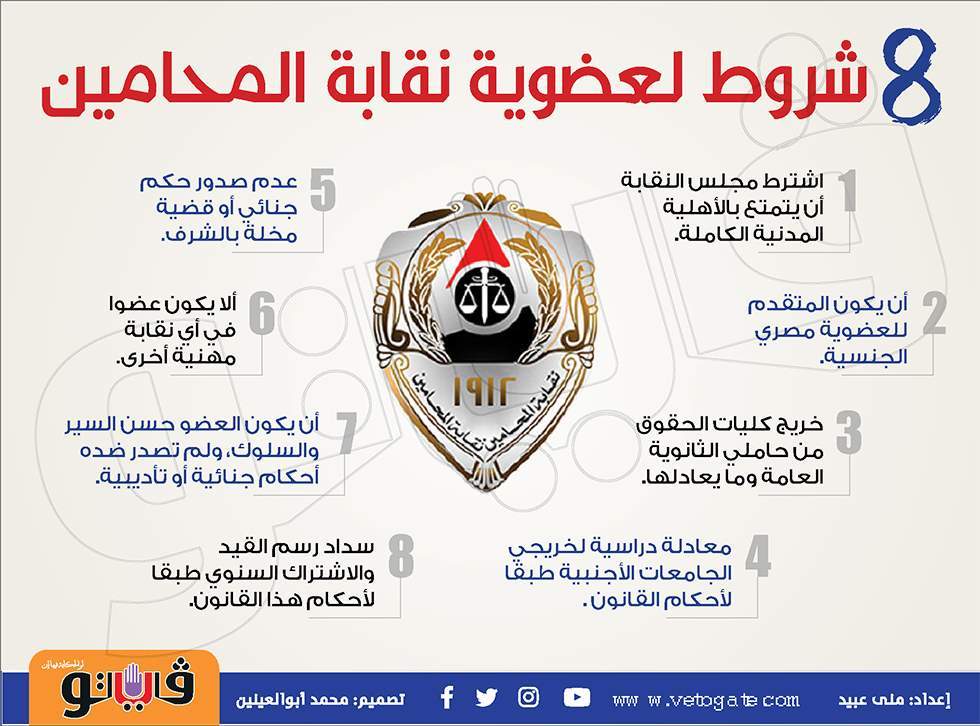 8 شروط لعضوية نقابة المحامين..إنفوجراف السبت 02/يناير/2021 - 12:54 م 1/2/2021 12:54:00 PM نقابة المحامين منى عبيد شارك طباعة 18 حجم الخط شارك طباعة نقابة المحامين المحامين شروط عضوية نقابة المحامين