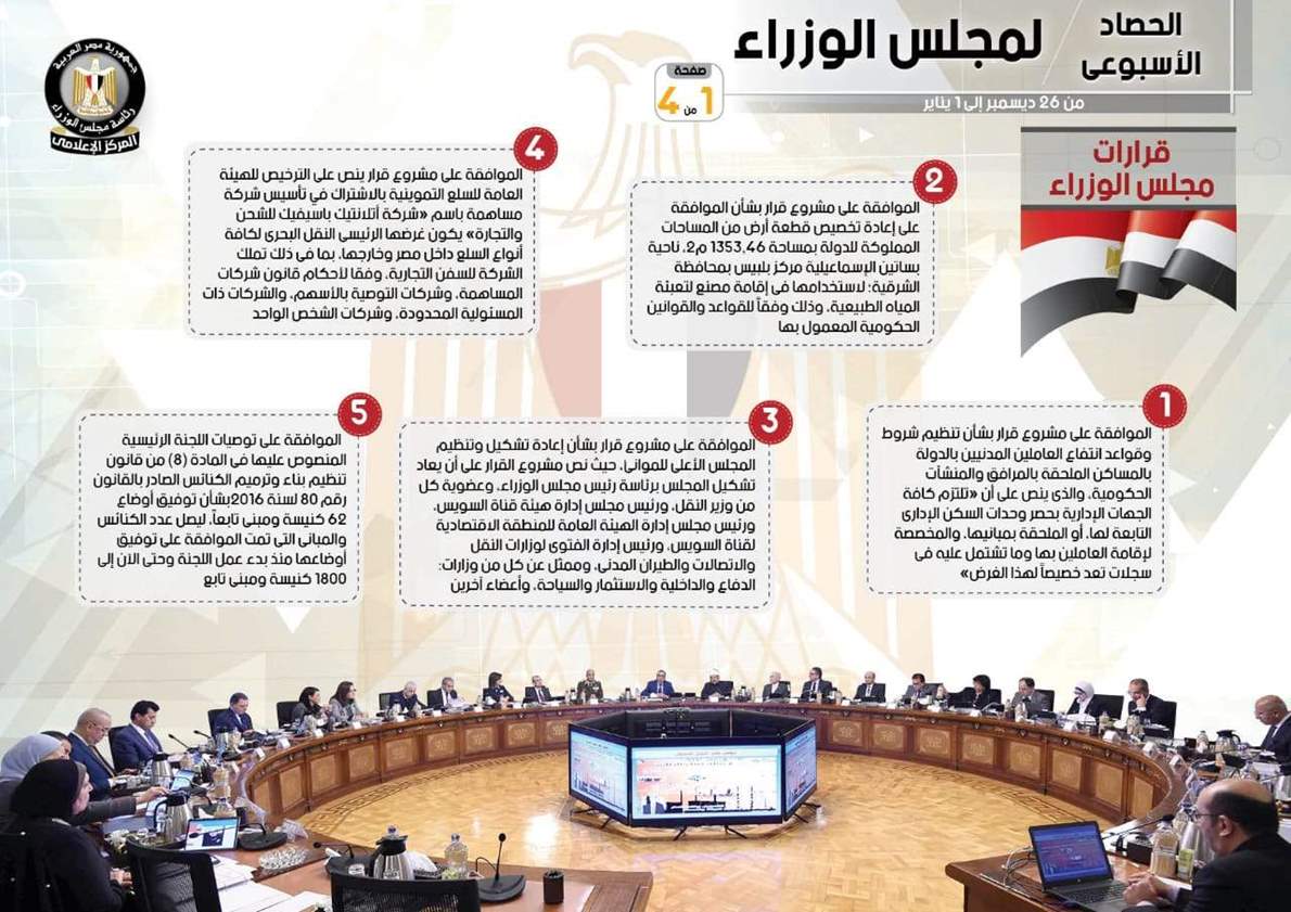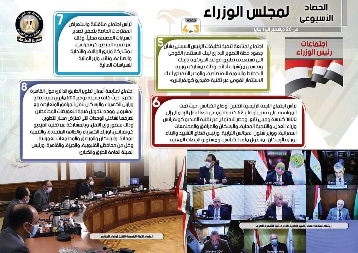 نشر المركز الإعلامي لمجلس الوزراء، تقريراً شمل إنفوجرافات سلط من خلالها الضوء على الحصاد الأسبوعي لمجلس الوزراء، وذلك خلال الفترة من 26 ديسمبر إلى 1 يناير، والذي تضمن الموافقة على عدد من القرارات، فضلاً عن الاجتماعات التي عقدها الدكتور مصطفى مدبولي، رئيس مجلس الوزراء، بالإضافة إلى ما قام به من أنشطة.