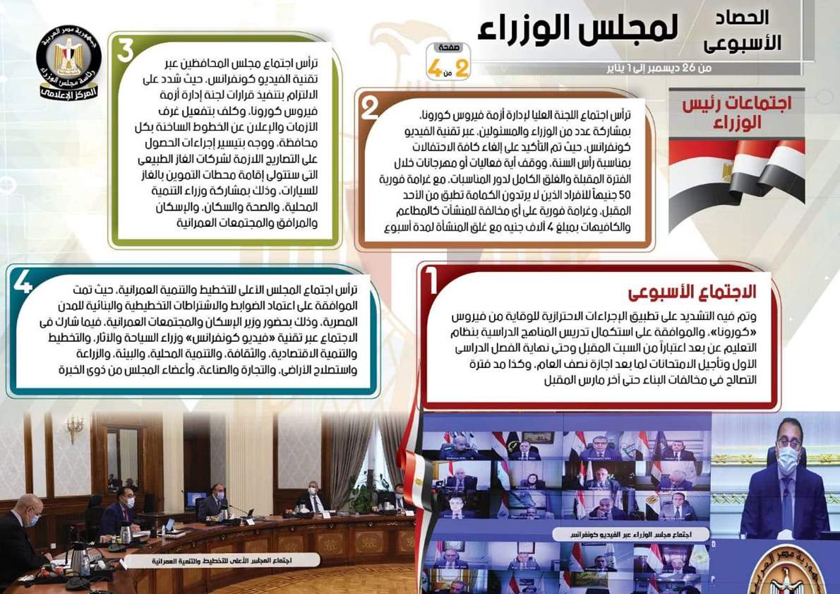 وعلى صعيد الاجتماعات التي عقدها الدكتور مصطفى مدبولي رئيس مجلس الوزراء، أشار التقرير إلى ترأس اجتماع اللجنة العليا لإدارة أزمة فيروس كورونا، بمشاركة عدد من الوزراء والمسئولين، عبر تقنية الفيديو كونفرانس، حيث تم التأكيد على إلغاء كافة الاحتفالات بمناسبة رأس السنة، ووقف أية فعاليات أو مهرجانات خلال الفترة المقبلة والغلق الكامل لدور المناسبات، مع غرامة فورية 50 جنيهاً للأفراد الذين لا يرتدون الكمامة تطبق من الأحد المقبل، وغرامة فورية على أي مخالفة للمنشآت كالمطاعم والكافيهات بمبلغ 4 آلاف جنيه مع غلق المنشأة لمدة أسبوع.