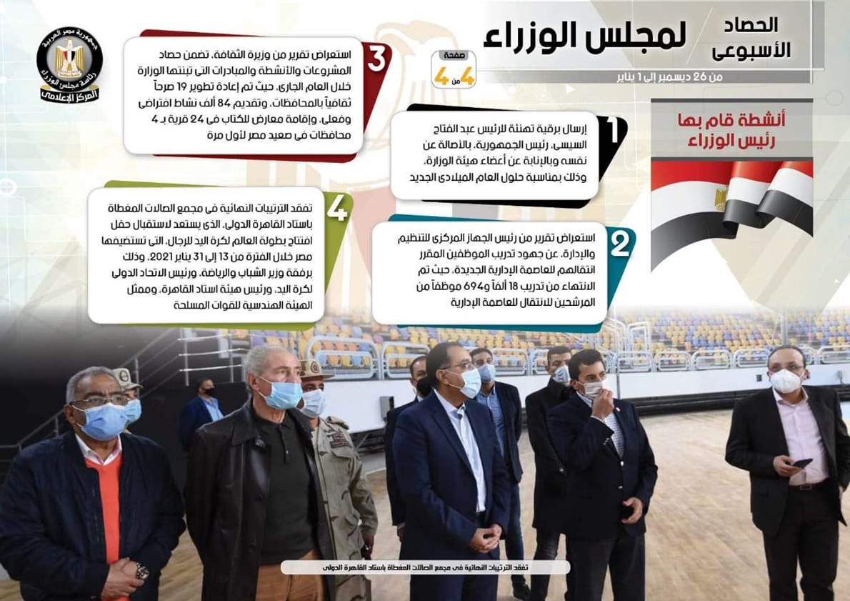 كما شملت الأنشطة أيضاً، استعراض رئيس الوزراء تقرير من وزيرة الثقافة، تضمن حصاد المشروعات والأنشطة والمبادرات التي تبنتها الوزارة خلال العام الجاري، حيث تم إعادة تطوير 19 صرحاً ثقافياً بالمحافظات، وتقديم 84 ألف نشاط افتراضي وفعلي، وإقامة معارض للكتاب في 24 قرية بـ 4 محافظات في صعيد مصر لأول مرة، بالإضافة إلى تفقد الترتيبات النهائية في مجمع الصالات المغطاة باستاد القاهرة الدولي، الذى يستعد لاستقبال حفل افتتاح بطولة العالم لكرة اليد للرجال، التي تستضيفها مصر خلال الفترة من 13 إلى 31 يناير 2021، وذلك برفقة وزير الشباب والرياضة، ورئيس الاتحاد الدولي لكرة اليد، ورئيس هيئة استاد القاهرة، وممثل الهيئة الهندسية للقوات المسلحة.