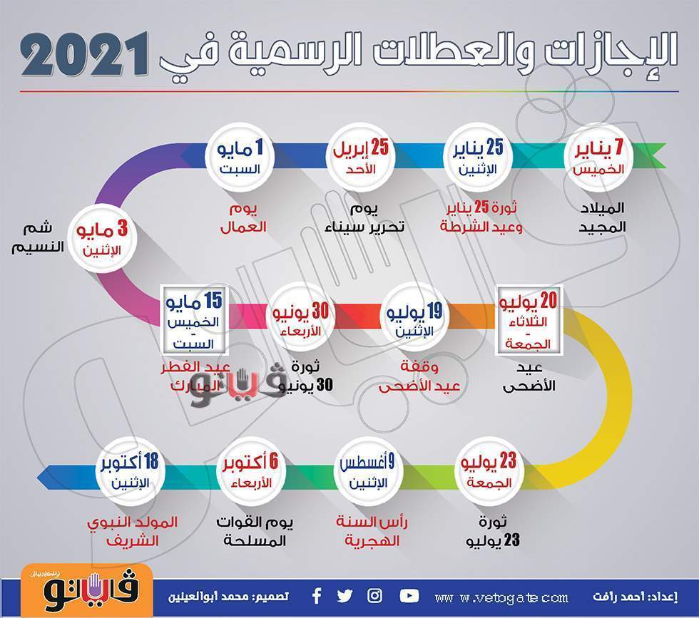 في إطار الخدمات التي تقدمها فيتو لقرائها، تنشر بوابة فيتو خريطة اجازات 2021 وتشمل الإجازات والعطلات الرسمية في 2021 وقرارات مجلس الوزراء بخصوص الإجازات الرسمية والعطلات الأسبوعية المقررة.