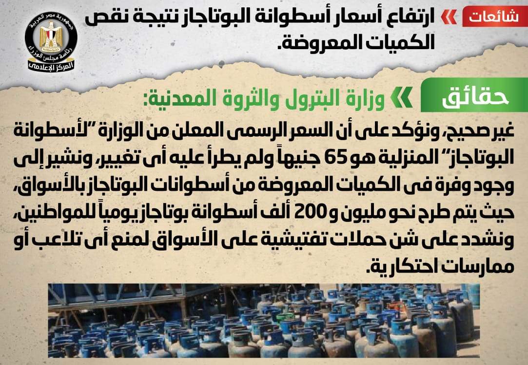 وقام المركز الإعلامي لمجلس الوزراء بالتواصل مع وزارة البترول والثروة المعدنية، والتي نفت تلك الأنباء، مُؤكدةً أنه لا صحة لارتفاع أسعار أسطوانة البوتاجاز، وإنه لا يوجد نقص في الكميات المعروضة.