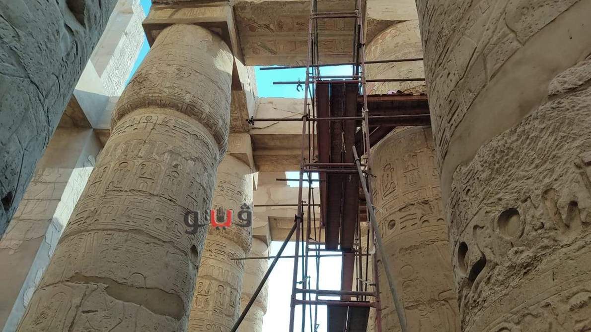 ورافق وزير الاثار المستشار مصطفى ألهم محافظ الأقصر، ونائبه محمد عبد القادر خيرى، ورجال السياحة والآثار، ترميمات أعمدة صالات الكرنك.