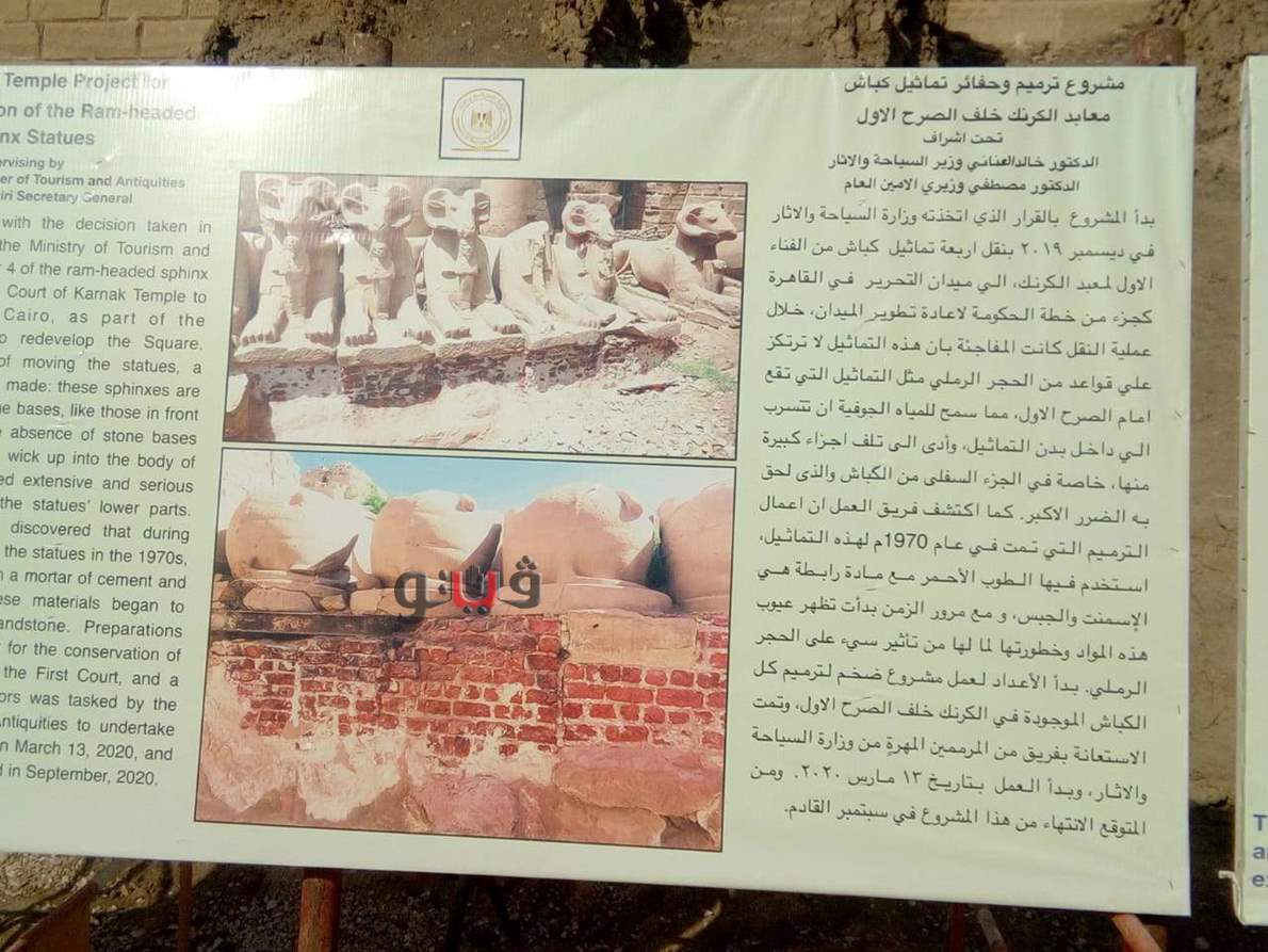 وأشار الي أن ذلك لمنع المياه الجوفية من التأثير السلبى على التماثبل لأنها منحوتة من الحجر الرملي، والذى يتأثر بسرعة بالماء والرطوبة الموجودة فى التربة، وكذلك وعمل قاعدة خرسانية حديثة لوضع التماثيل عليها بعد إنتهاء أعمال الترميم والصيانة والتى تتم بواسطة فريق متخصص من الآثريين والمصورين والمرممين والفنيين التابعين لوزارة الآثار، وتحت إشراف الوزارة مباشرة وبالتنسيق مع منطقة آثار الكرنك.