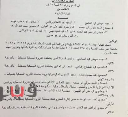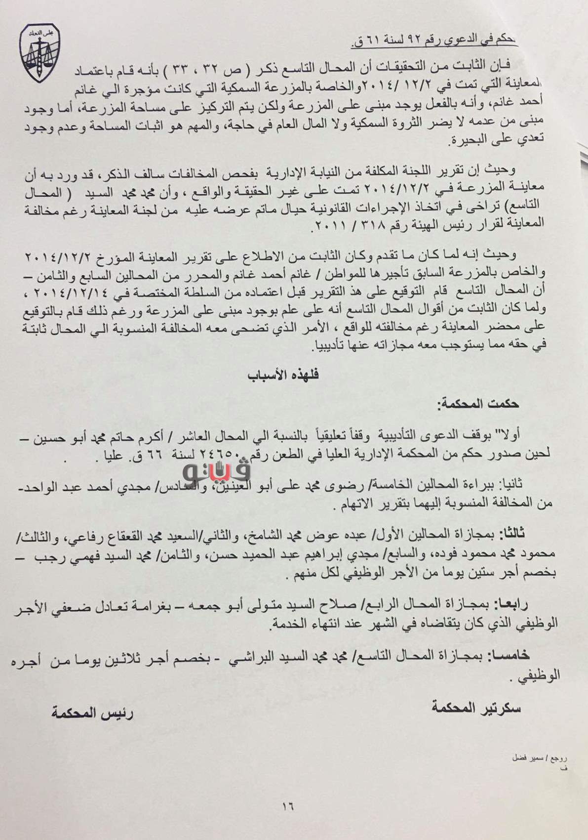 وقضت المحكمة ببراءة رضوى محمد علي، مهندسة بإدارة المشروعات ومجدي أحمد عبد الواحد، مدير إدارة المشروعات، وخصم أجر 60 يومًا من راتب كل من مجدي إبراهيم عبد الحميد ومحمد السيد فهمي، المهندسين بمنطقة دمياط للثروة السمكية، وخصم أجر 30 يمومًا من راتب محمد محمد السيد، مدير إدارة المرابي