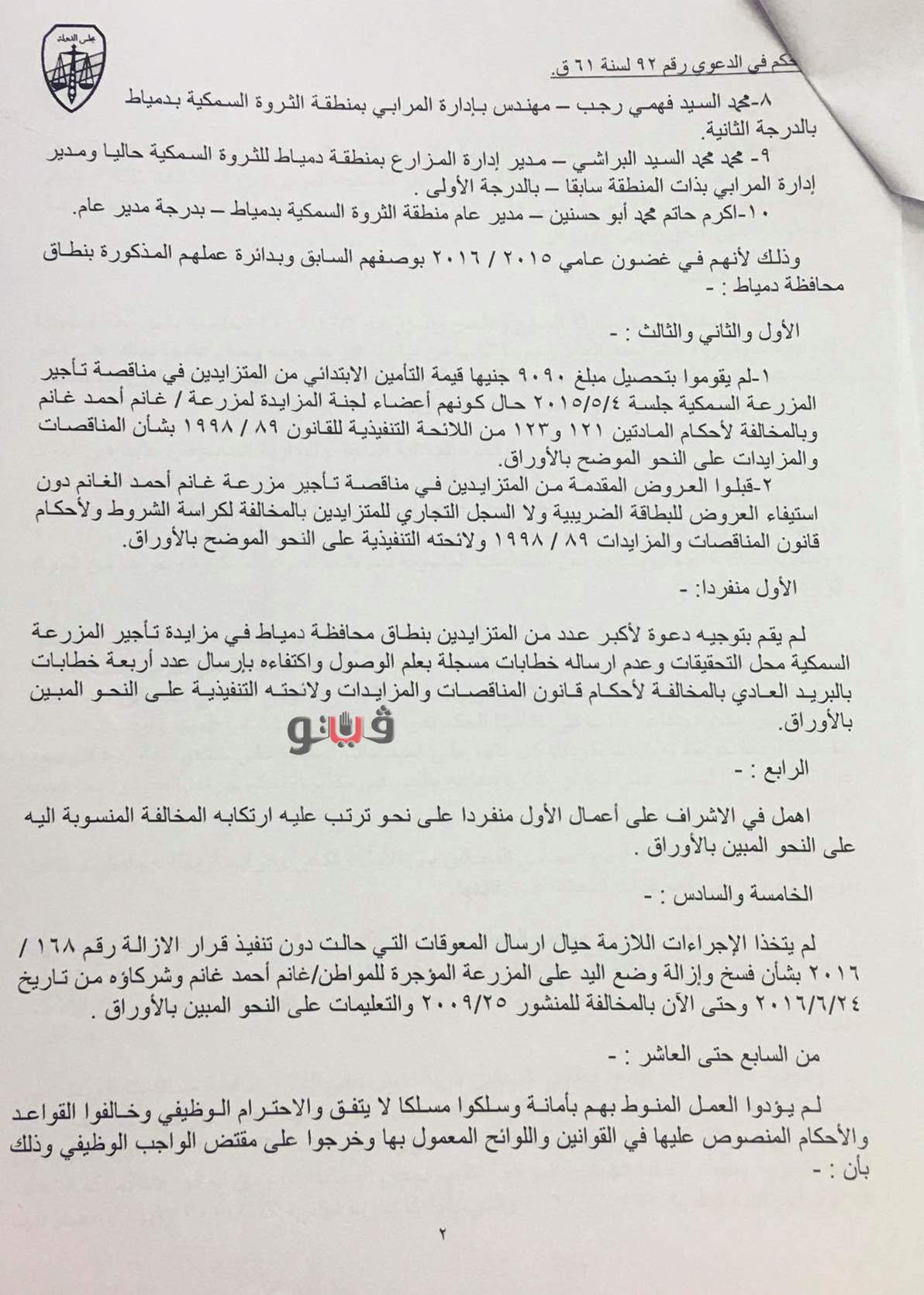 تضمن الحكم خصم أجر 60 يومًا من راتب كلًا من عبده عوض محمد، رئيس قسم التأجير بمنطقة الثروة السمكية بدمياط والسعيد محمد رفاعي، أخصائي تعاون ومحمود محمد فودة، مدير الشئون المالية والإدارية.