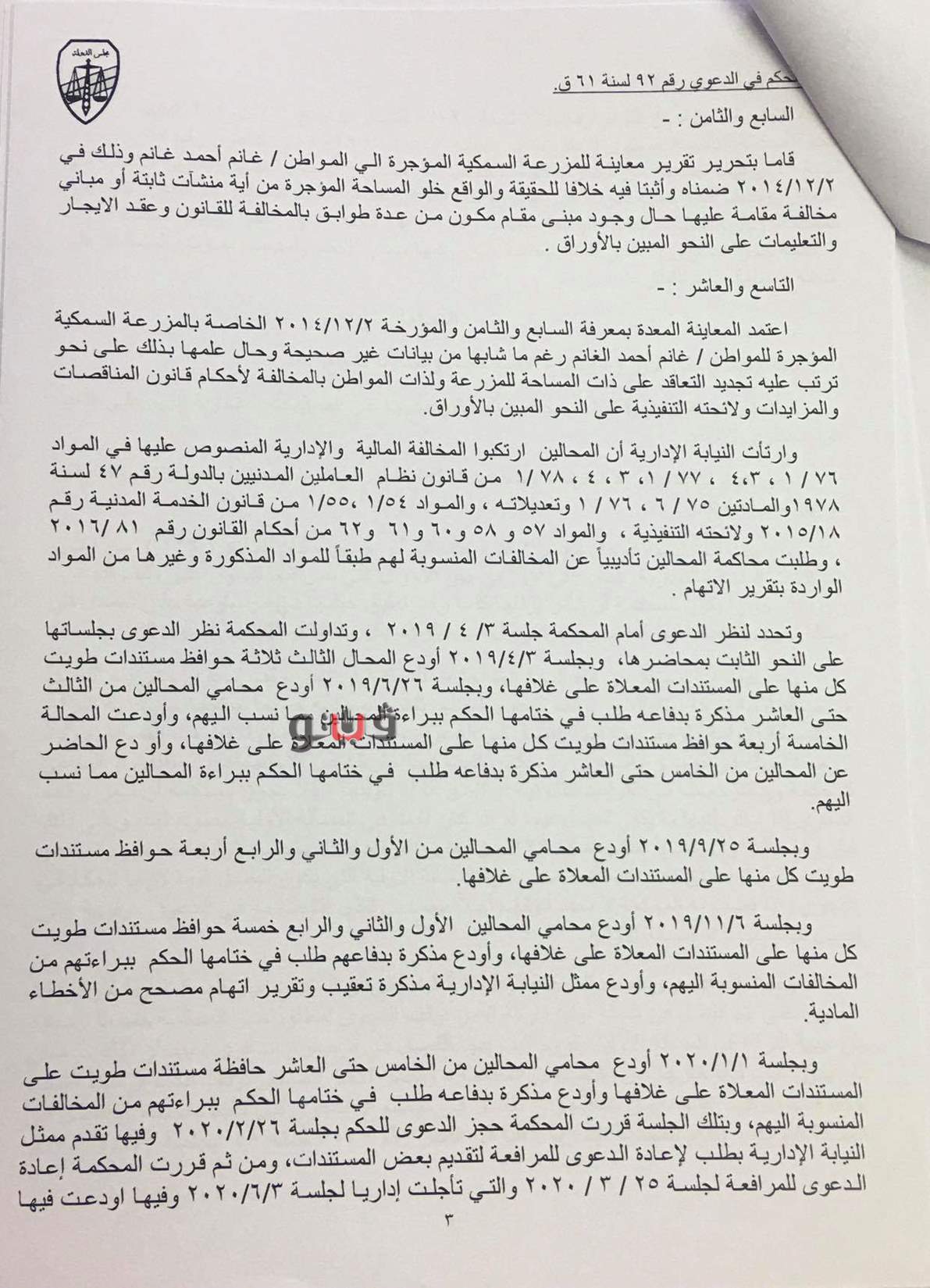 وأعتمد المخالف التاسع المعاينة الخاصة بالمزرعة السمكية المؤجرة رغم ما شابها من بيانات غير صحيحة رغم علمهما بذلك مما ترتب عليه تجديد التعاقد للمزرعة لذات المواطن بالمخالفة للقانون.