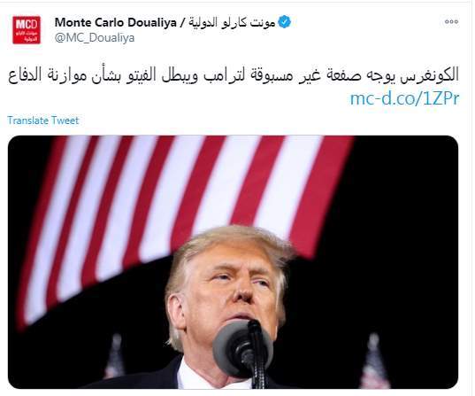 أكدت إذاعة "مونت كارلو الدولية" أن الكونجرس الأمريكي وجه صفعة غير مسبوقة للرئيس الأمريكي المنتهية ولايته دونالد ترامب، وبدأت العام الجديد 2021، بالتصويت بغالبيّة كبيرة، لصالح إبطال الفيتو الذي استخدمه الرئيس المنتهية ولايته ضدّ إقرار موازنة الدفاع.