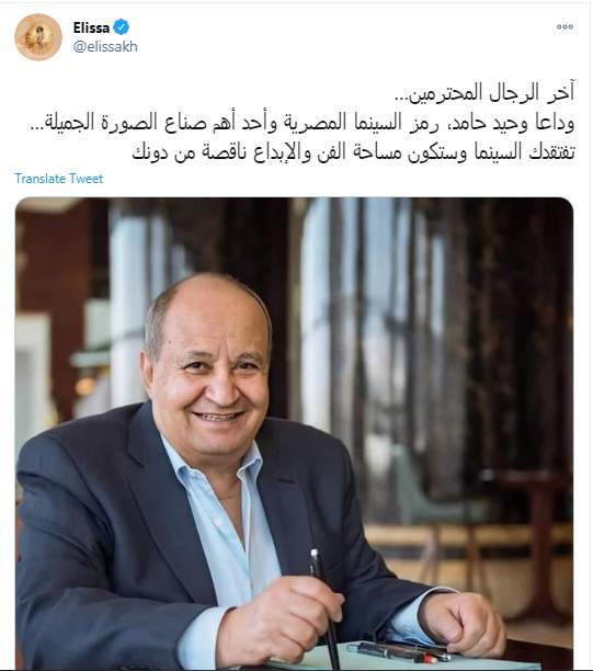 نعت الفنانة اللبنانية إليسا الكاتب والسيناريست وحيد حامد، ووصفته بآخر الرجال المحترمين، مؤكدة أنه رمز للسينما المصرية وأحد أهم صناع الصورة الجميلة.