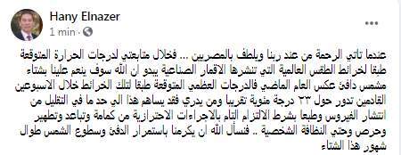 وكتب د.هاني الناظر تدوينة على الفيس بوك "عندما تاتي الرحمة من عند ربنا ويلطف بالمصريين … فخلال متابعتي لدرجات الحرارة المتوقعة طبقا لخرائط الطقس العالمية التي تنشرها الاقمار الصناعية يبدو ان الله سوف ينعم علينا بشتاء مشمس دافئ عكس العام الماضي فالدرجات العظمي المتوقعة طبقا لتلك الخرائط خلال الاسبوعين القادمين تدور حول ٢٣ درجة مئوية تقريبا"