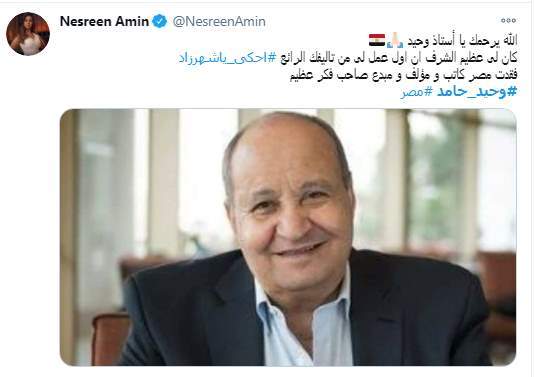 وكتبت نسرين طافش تغريدة على تويتر: "الكاتب القدير وحيد حامد في ذمة الله.. ودعنا اليوم أحد الكتاب الكبار الذين اثرو الفن العربي بفكرهم الحر الانساني الواسع المبتكر .. السلام لروحه الطيبة و العزاء لابنه الاستاذ المخرج مروان حامد و عائلته الكريم.. #وحيد_حامد"