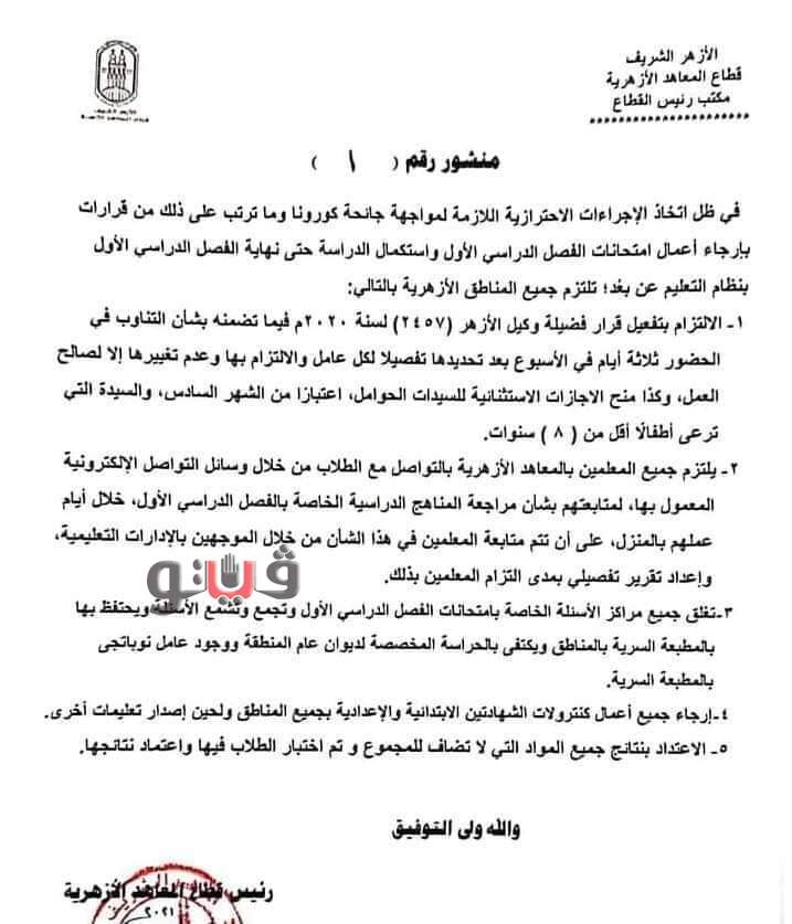 أصدر قطاع المعاهد الأزهرية، عدة قرارات، عقب قرار تأجيل الامتحانات للفصل الدراسي الأول وتعليق حضور الطلاب للمعاهد، وذلك وفق رؤية الدولة المصرية للحد من انتشار فيروس كورونا وحرصا منها على سلامة الطلاب.