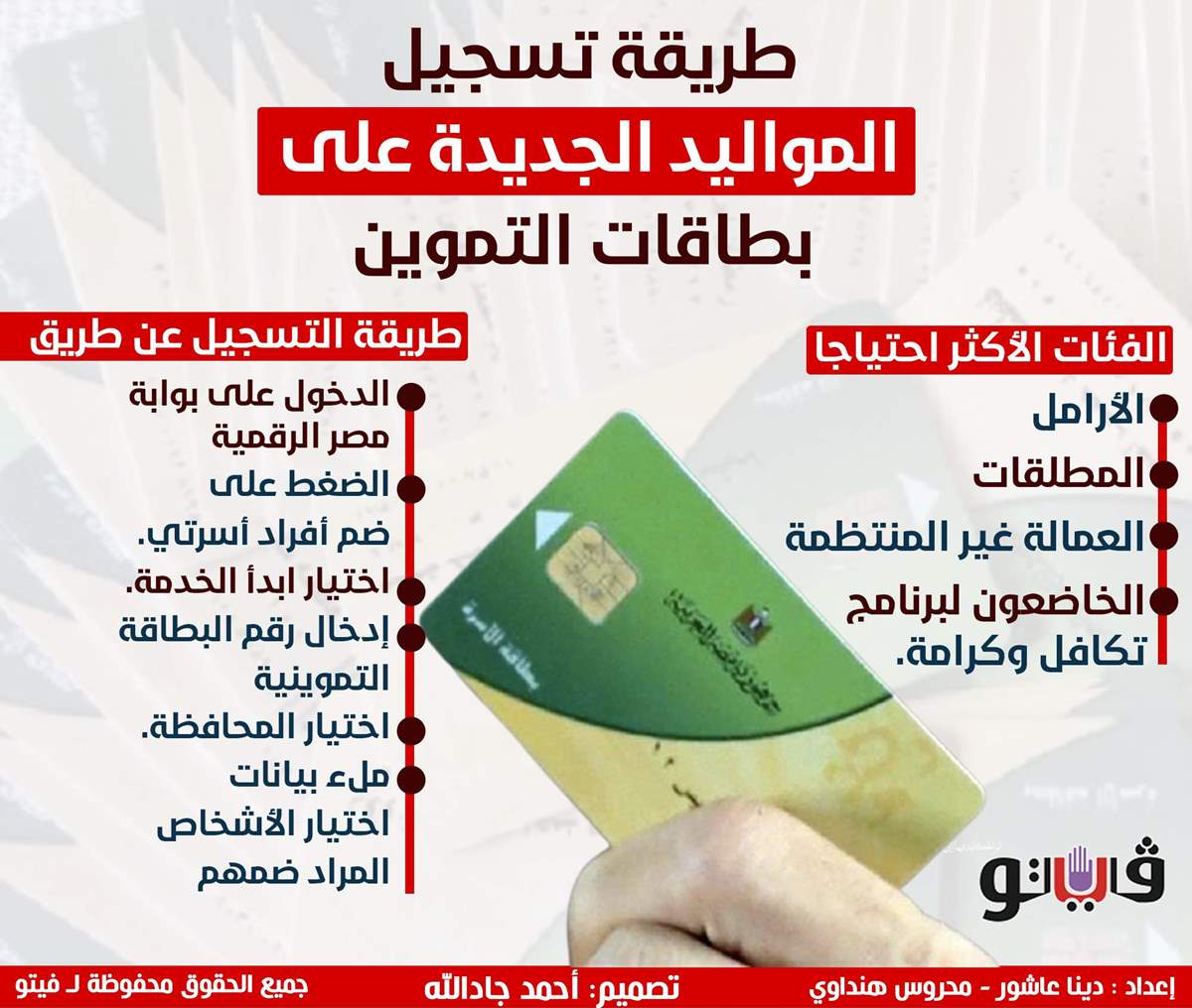 طريقة تسجيل المواليد الجديدة على بطاقات التموين| إنفوجراف الإثنين 01/فبراير/2021 - 02:05 ص 2/1/2021 2:05:27 AM بطاقة التموين دينا عاشور - محروس هنداوي شارك طباعة 18 حجم الخط شارك طباعة وزارة التموين والتجارة الداخلية التموين موقع دعم مصر برنامج تكافل وكرامة العمالة غير المنتظمة بوابة مصر الرقمية اضافة المواليد الجديدة