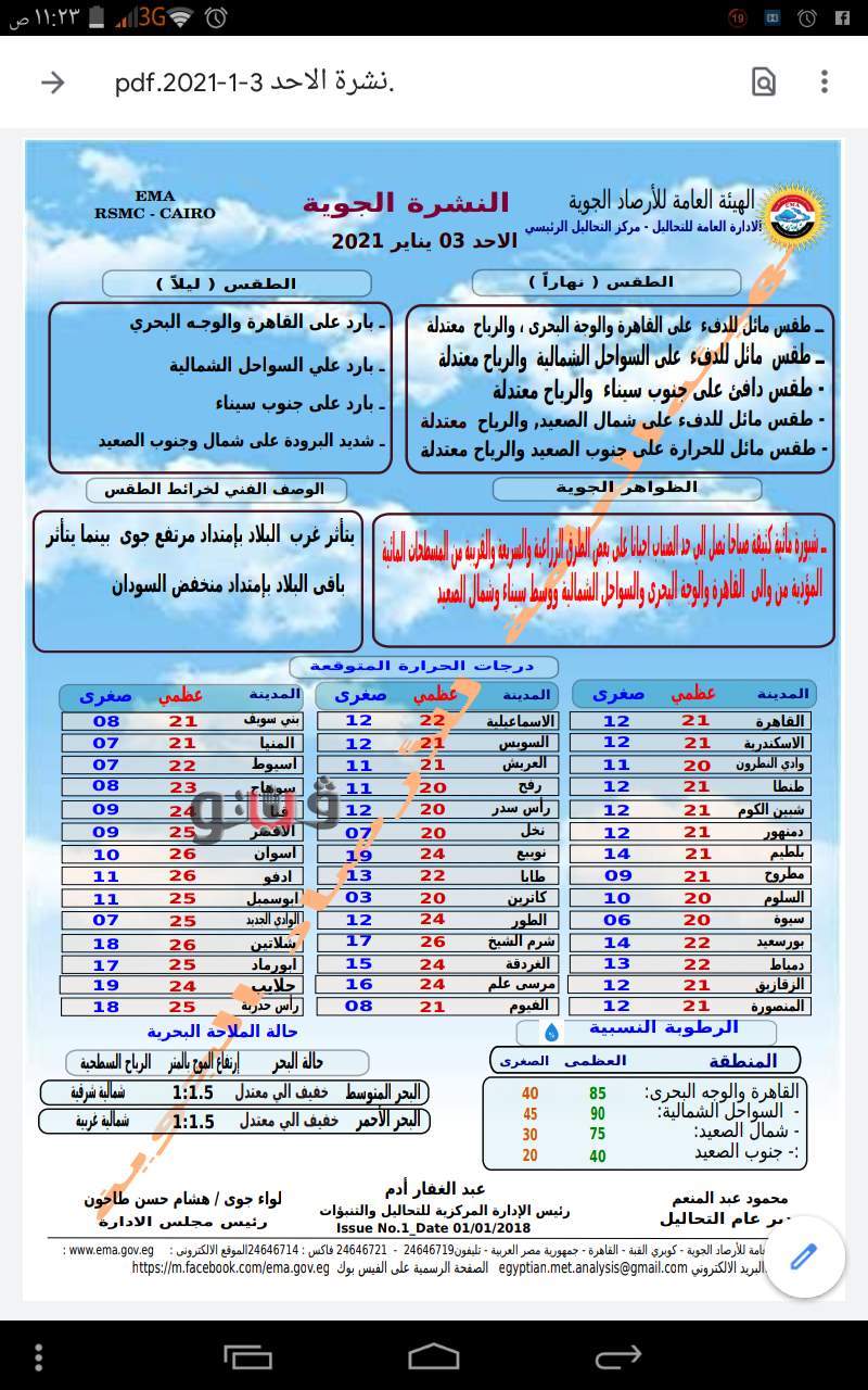 ومن المتوقع حدوث شبورة مائية صباحية على الطرق الزراعية والسريعة تكون كثيفة على القاهرة والوجه البحري وشمال الصعيد ومدن القناة وسيناء والسواحل الشمالية تصل لحد الضباب الأيام الآتية: الأحد والإثنين والثلاثاء والأربعاء.