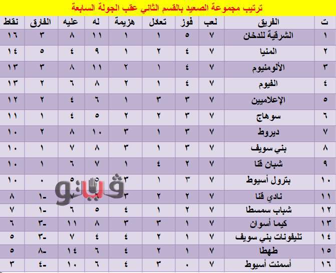 دوري القسم الثاني | جدول ترتيب مجموعة الصعيد بعد الجولة السابعة