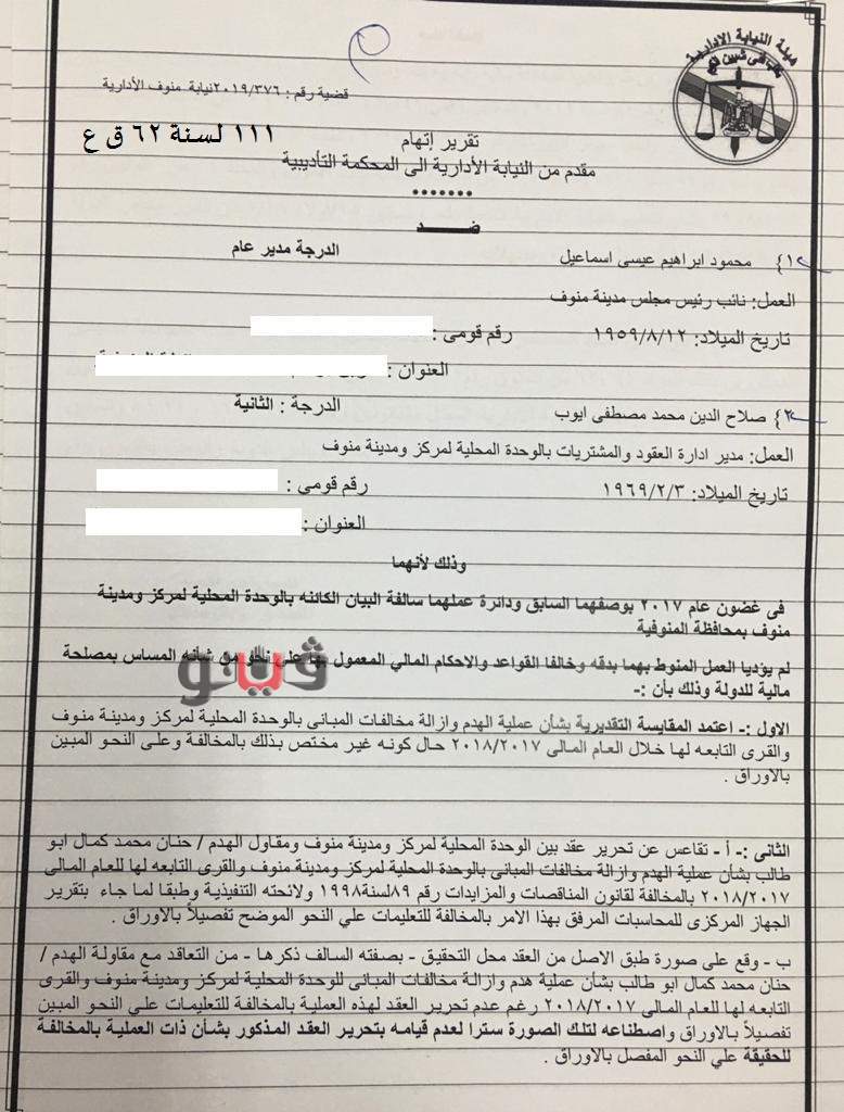 إحالة نائب رئيس مدينة منوف ومدير العقود للمحاكمة بسبب إزالة مخالفات البناء