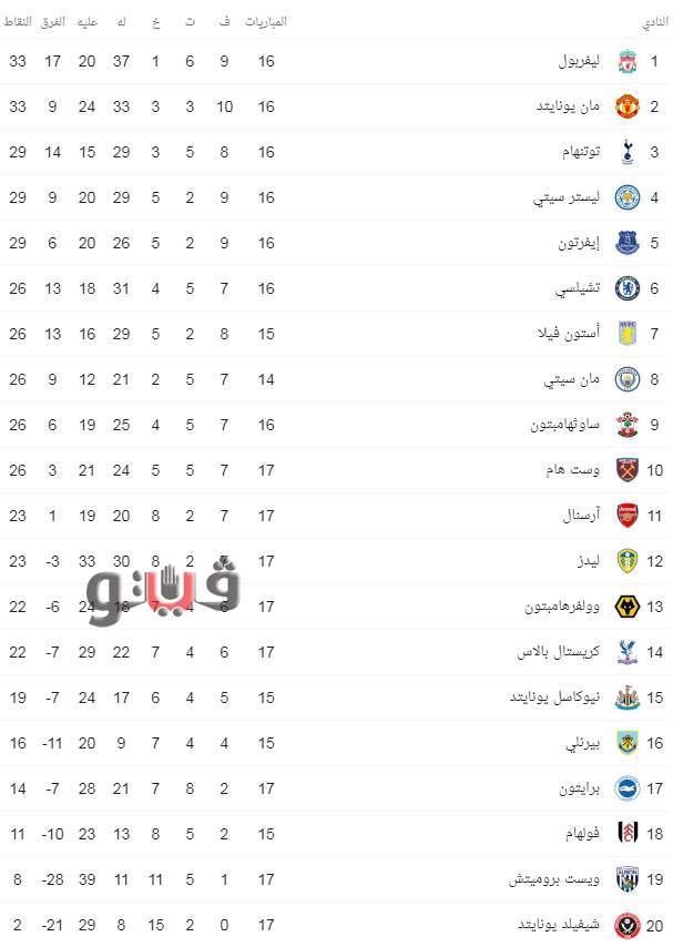 يتصدر فريق ليفربول ترتيب فرق الدوري الإنجليزي برصيد 33 نقطة، فيما يحل مانشيستر يونايتد في المركز الثاني بنفس الرصيد من النقاط.