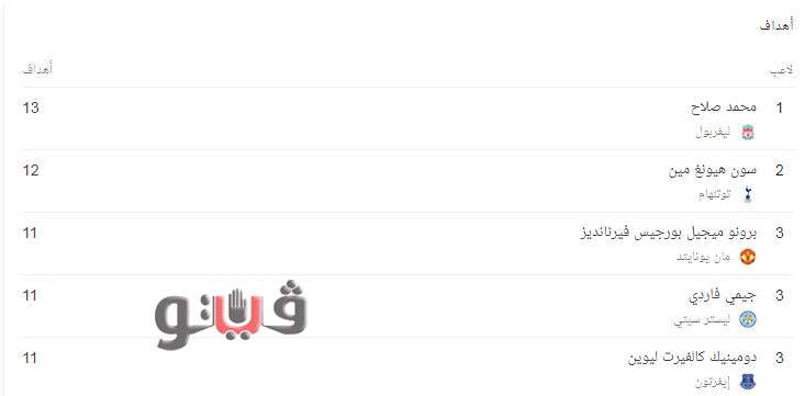 ويحتل محمد صلاح لاعب المنتخب الوطني والمحترف ضمن صفوف فريق ليفربول الإنجليزي صدارة قائمة الهدافين بـ 13 هدف، وفي المركز الثاني يأتي سون هيونج مين بـ12 هدف.