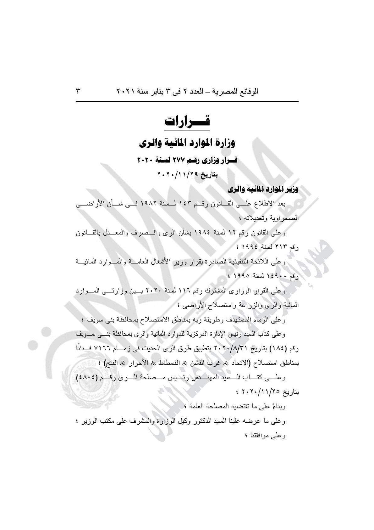نشرت جريدة الوقائع المصرية في عددها رقم 2، الصادر في 3 يناير 2021، قرار وزارة الموارد المائية والرى رقم 277 لسنة 2020، باستبدال نظام الري بزمام استصلاح قرى (الاتحاد، وغرب الفشن، والفسطاط، والأحرار، والفتح) بنطاق محافظة بنى سويف.