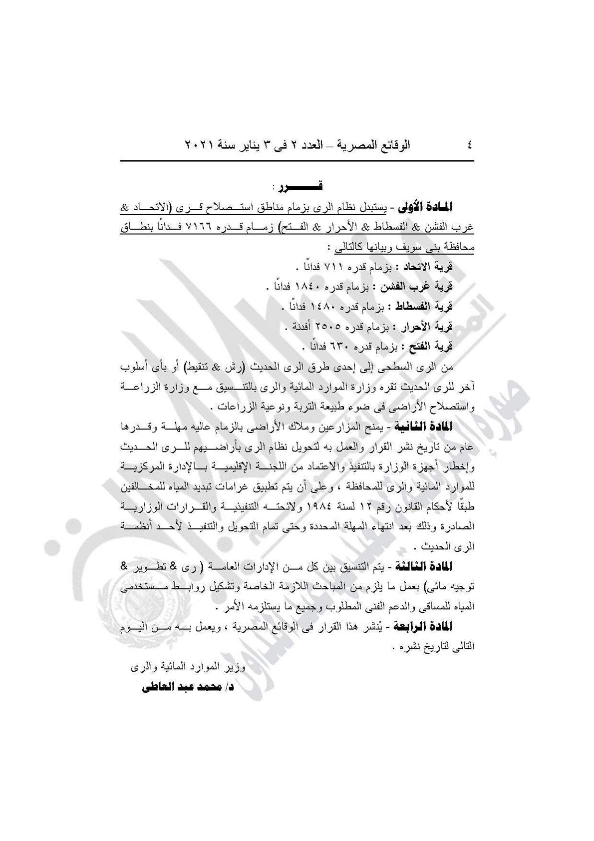 وينص القرار في مادته الأولى على استبدال نظام الرى بزمام مناطق استصلاح قرى (الاتحاد، وغرب الفشن، والفسطاط، والأحرار، والفتح) زمام قدره 7166 فدانًا بنطاق محافظة بنى سويف وبيانها كالتالى: قرية الاتحاد: بزمام قدره 711 فدانًا، وقرية غرب الفشن: بزمام قدره 1840 فدانًا، وقرية الفسطاط: بزمام قدره 1480 فدانًا، وقرية الأحرار: بزمام قدره 2505 أفدنة، وقرية الفتح: بزمام قدره 630 فدانًا.