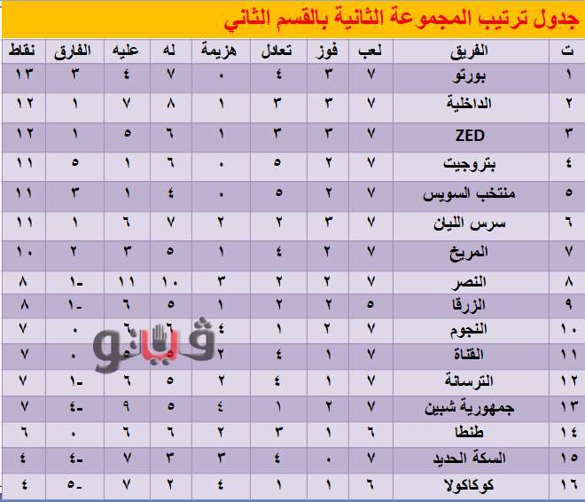 وكانت نتائج مباريات الجولة السابعة لمجموعة القاهرة والقناة في دوري القسم الثاني لكرة القدم بمشاركة 16 فريقا والتي أقيمت أمس السبت أسفرت عن التالي ..