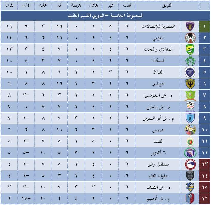 يواصل الفريق الأول لكرة القدم بنادي المصرية للإتصالات تصدر قمة المجموعة الخامسة لدوري القسم الثالث بعد مرور الجولة السادسة.