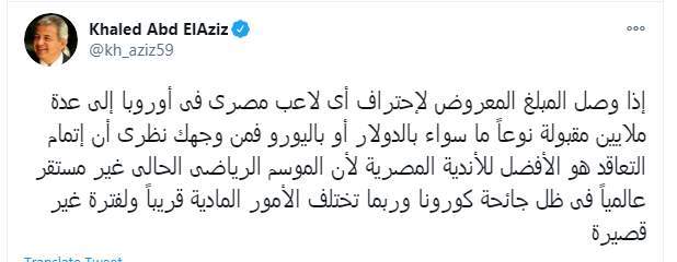 وكتب خالد عبد العزيز تغريدة على تويتر "إذا وصل المبلغ المعروض لاحتراف أى لاعب مصرى فى أوروبا إلى عدة ملايين مقبولة نوعاً ما سواء بالدولار أو باليورو فمن وجهة نظرى أن إتمام التعاقد هو الأفضل للأندية المصرية لأن الموسم الرياضى الحالى غير مستقر عالمياً فى ظل جائحة كورونا وربما تختلف الأمور المادية قريباً ولفترة غير قصيرة"