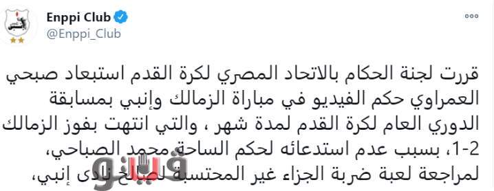 وقال إنبي عبر حسابه الرسمي بموقع التواصل الاجتماعي "فيس بوك": "قررت لجنة الحكام بالاتحاد المصر لكرة القدم، استبعاد صبحي العمراوي حكم الفيديو في مباراة الزمالك بمسابقة الدوري العام لمدة شهر والتي انتهت بفوز الزمالك 2-1".