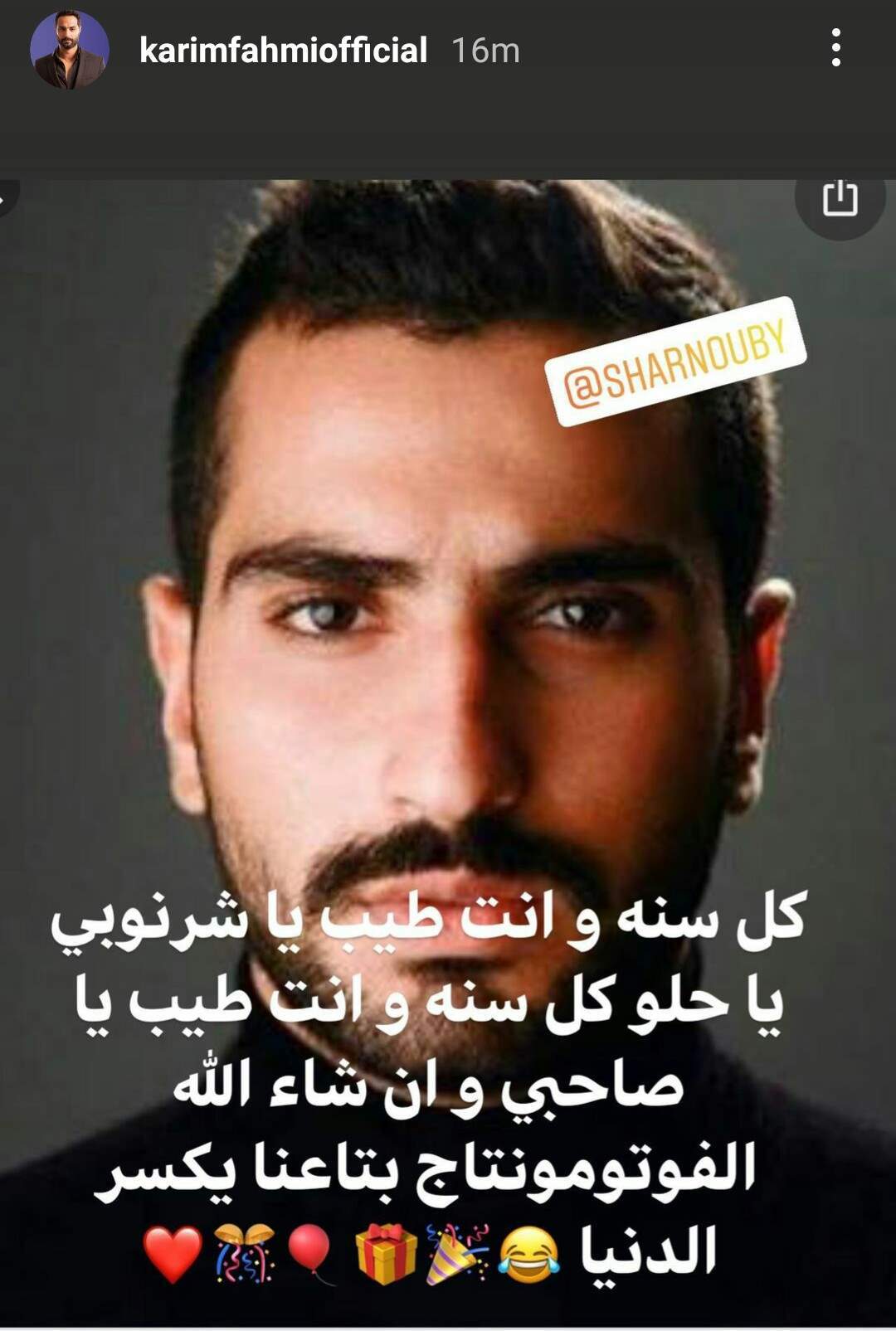 ونشر كريم فهمي صورة لمحمد الشرنوبي عبر "ستوري انستجرام" معلقا عليها قائلا: "كل سنة وأنت طيب يا شرنوبي يا حلو كل سنة وأنت طيب يا صاحبي.. وإن شاء الله الفوتومونتاج بتاعنا يكسر الدنيا".