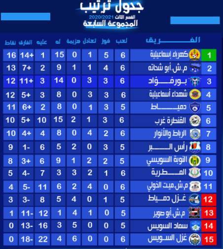 وتشهد المجموعة منافسة قوية علي تذكرة التأهل لدوري القسم الثاني في الموسم الجديد، وحافظت 5 فرق علي سجل عدم الخسارة بعد مرور الجولة السادسة للمسابقة وهم فرق كهرباء الاسماعيلية وشهداء الاسماعلية وبورفؤاد ودمياط والرباط والأنوار.