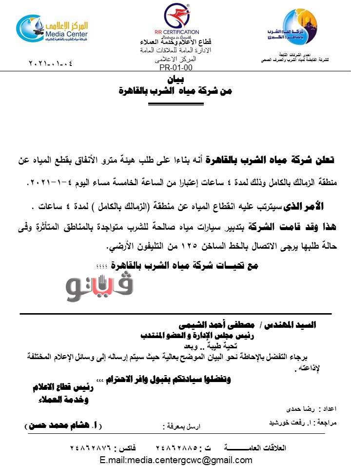 أعلنت شركة مياه القاهرة، عن قطع مياه الشرب عن منطقة الزمالك بالكامل لمدة ٤ ساعات، اعتبارًا من الساعة الخامسة مساء اليوم، وذلك نظرا لأعمال المترو بالمنطقة.