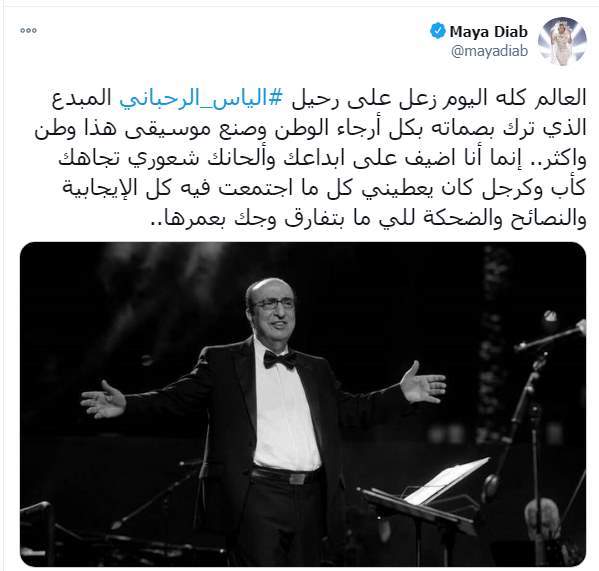وكتبت مايا دياب تغريدة لها عبر صفحتها الرسمية على موقع التدوينات القصيرة "تويتر": "العالم كله اليوم زعل على رحيل إلياس الرحباني المبدع الذي ترك بصماته بكل أرجاء الوطن وصنع موسيقى هذا وطن وأكثر.. إنما أنا اضيف على إبداعك وألحانك شعوري تجاهك كأب وكرجل كان يعطيني كل ما اجتمعت فيه كل الإيجابية والنصائح والضحكة للي ما بتفارق وجك بعمرها".