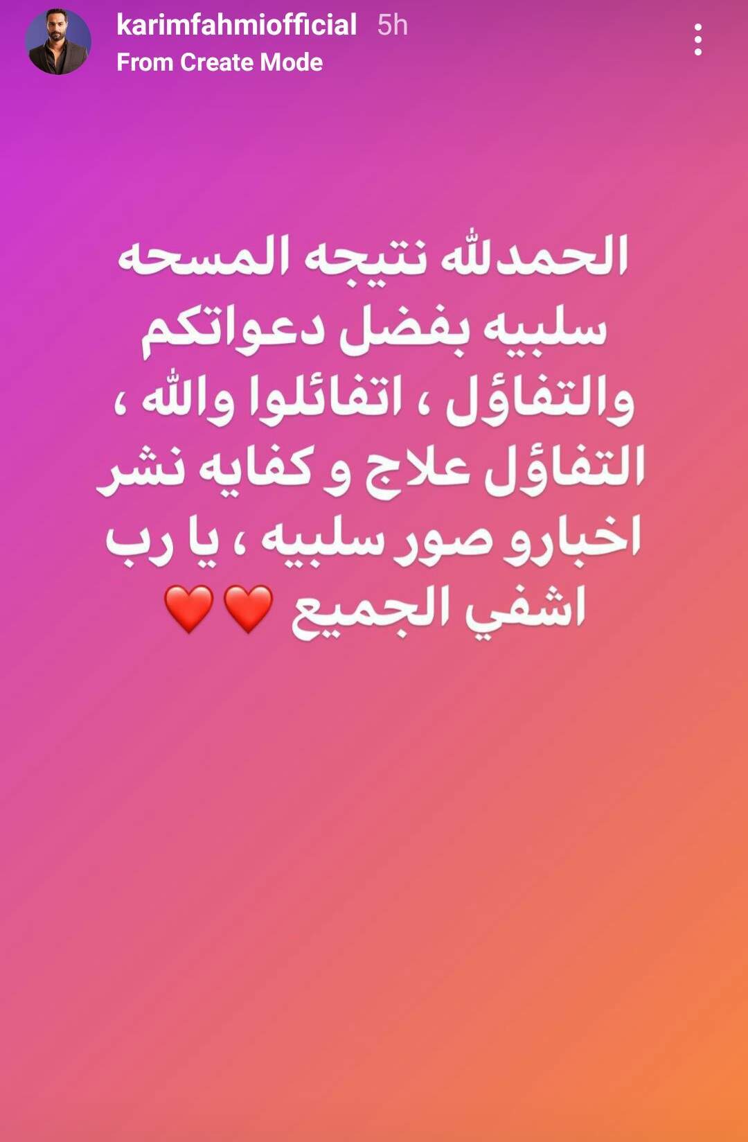 وكتب كريم فهمي قائلا: "الحمة لله نتيجة المسحة سلبية بفضل دعواتكم والتفاؤل، تفاءلوا والله، التفاؤل علاج وكفاية نشر أخبار وصور سلبية، يا رب اشف الجميع".