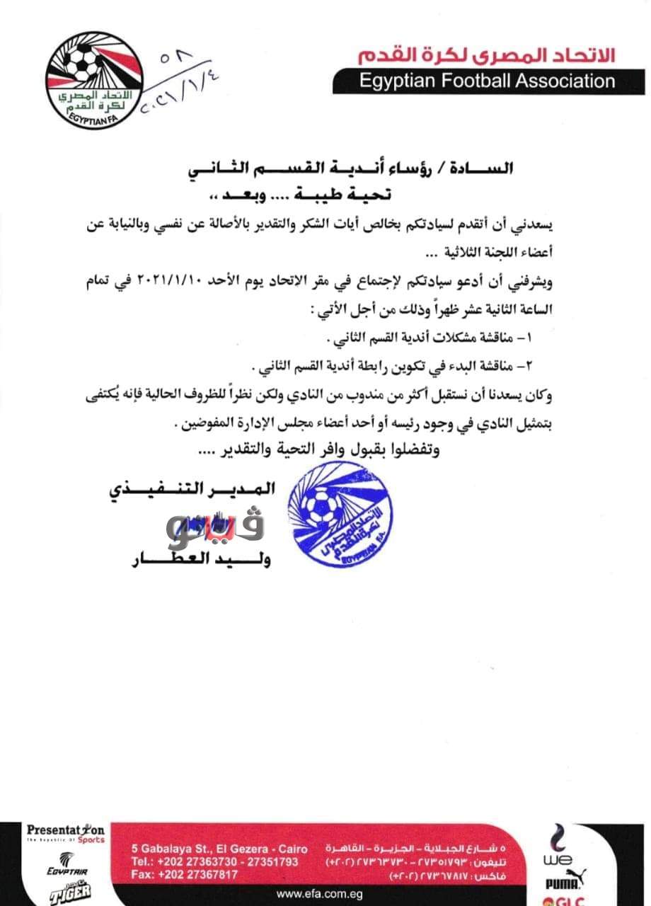 وجهت اللجنة الثلاثية التي تدير اتحاد الكرة، الدعوة لأندية القسم الثاني، للاجتماع يوم الأحد المقبل بمقر الجبلاية.