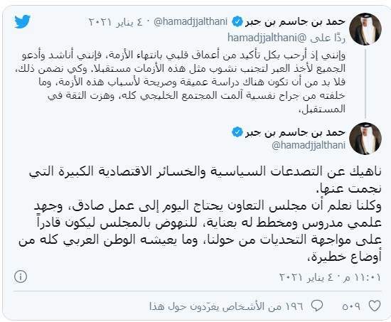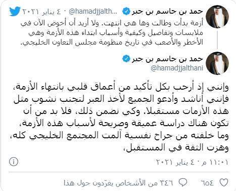 وقال "بن جاسم" في عدة تغريدات عبر حسابه بموقع تويتر: "أزمة بدأت وطالت وها هي انتهت.. ولا أريد أن أخوض الآن في ملابسات وتفاصيل وكيفية وأسباب ابتداء هذه الأزمة، وهي الأخطر والأصعب في تاريخ منظومة مجلس التعاون الخليجي".