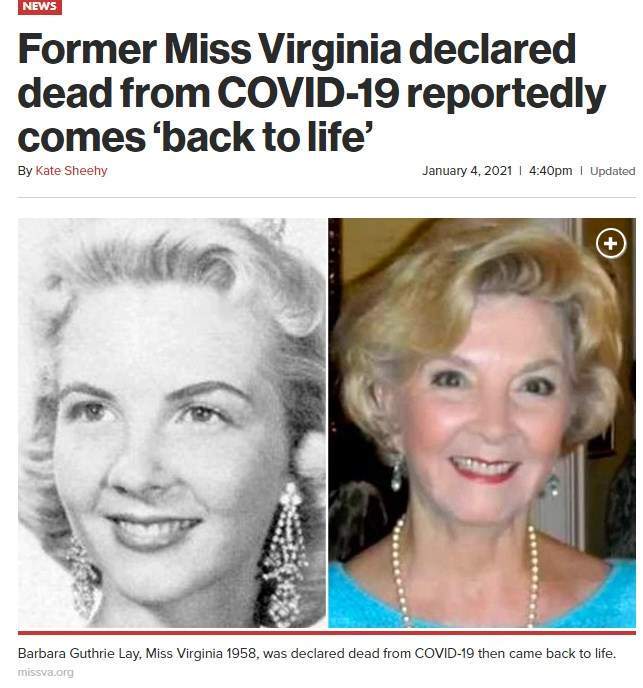 ذكرت صحيفة "نيويورك بوست" إن باربرا جوثري لاي "ملكة جمال فيرجينيا السابقة"، البالغة من العمر 82 عاما، ماتت عشية عيد الميلاد بعد إصابتها بكوفيد-19، لكنها "عادت إلى الحياة بأعجوبة".