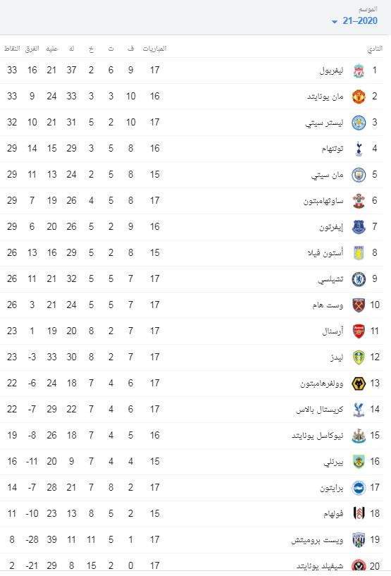 جدول ترتيب الدورى الإنجليزي