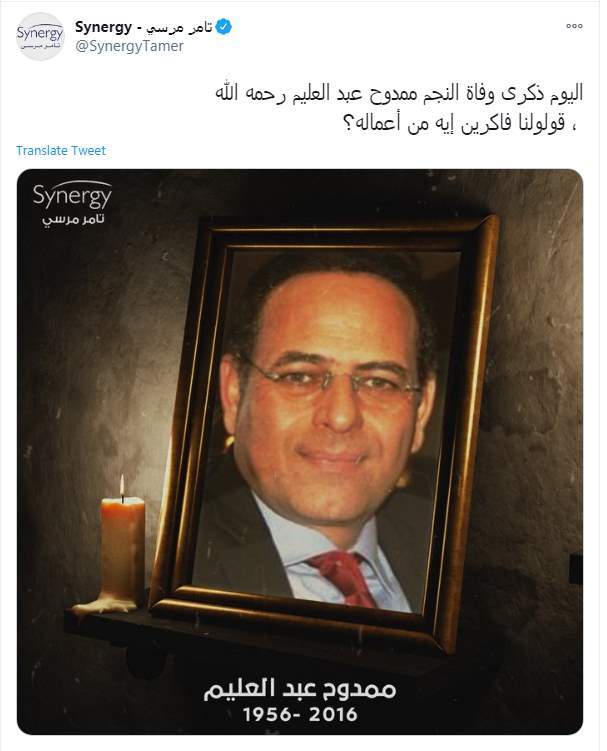 وكتب تامر مرسي تغريدة على "تويتر": "اليوم ذكرى وفاة النجم ممدوح عبد العليم رحمه الله، قولوا لنا فاكرين إيه من أعماله؟".