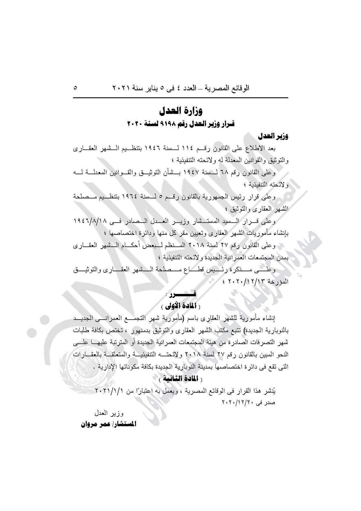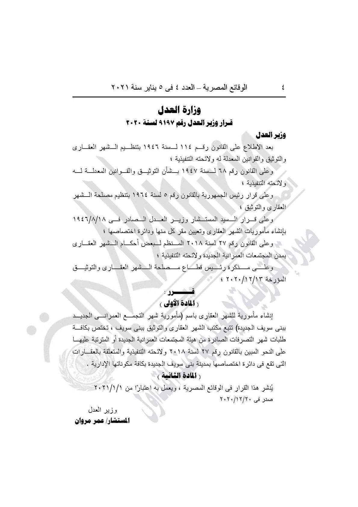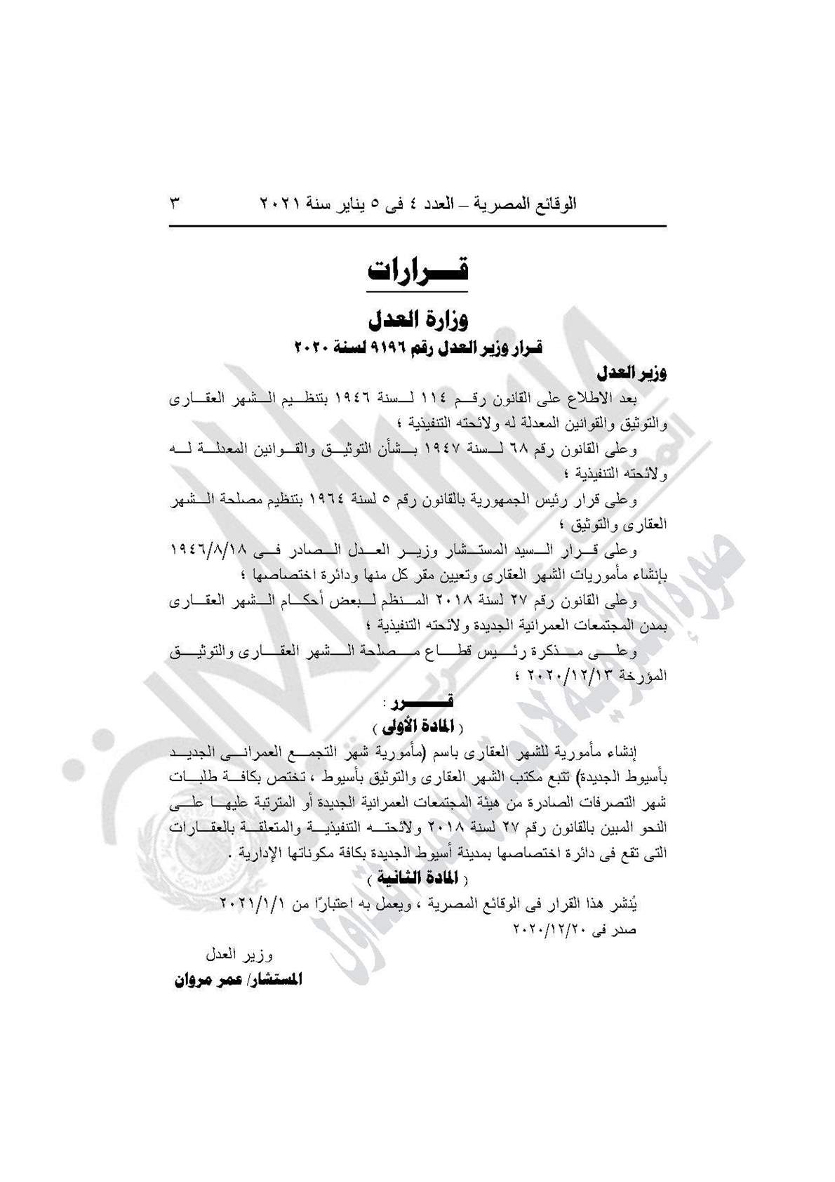 نشرت جريدة الوقائع المصرية في عددها رقم 4، الصادر في 5 يناير 2021، 3 قرارات لوزير العدل المستشار عمر مروان، بشأن إنشاء مأمورية للشهر العقارى باسم مأمورية شهر التجمع العمرانى الجديد بأسيوط الجديدة وبنى سويف الجديدة والنوبارية الجديدة.