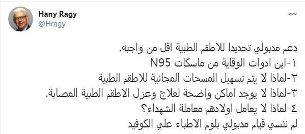 وكتب هاني راجي تغريدة على تويتر قال فيها: "دعم مدبولي تحديدا للأطقم الطبية أقل من واجبه.