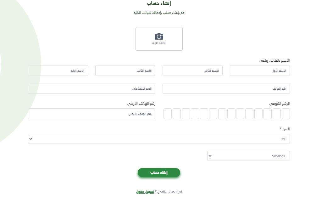 عند الدخول على الموقع يتطلب منك إنشاء حساب جديد باسمك من خلال إدخال بيانات اسمك رباعيا والرقم القومي الخاص بك ووسائل التواصل