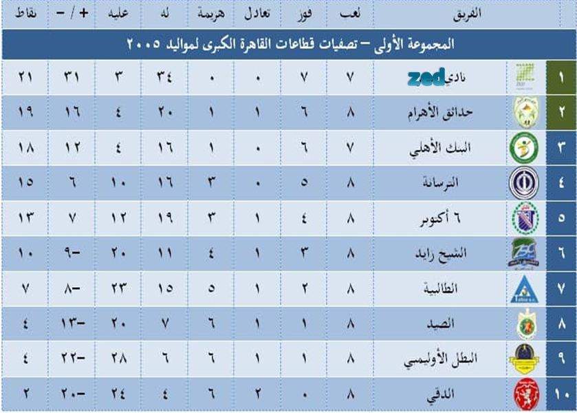 تربع فريق زد على قمة تصفيات دوري الجيزة للناشئين لكرة القدم مواليد 2005 بعد مرور الجولة الثامنة.