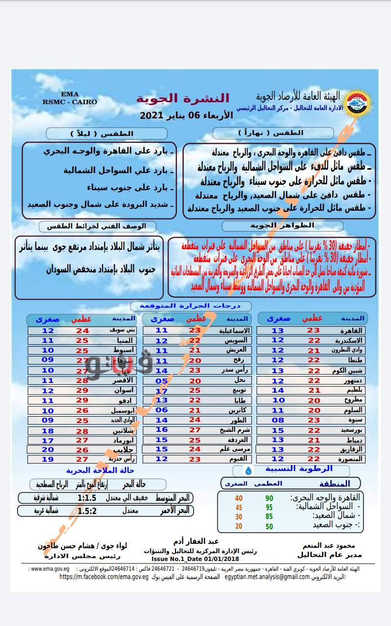 كما حذرت هيئة الأرصاد الجوية من شبورة مائية صباحية تكون كثيفة على الطرق الزراعية والسريعة والقريبة من المسطحات المائية فى الطرق المؤدية الى القاهرة والوجه البحرى وشمال الصعيد وسيناء والسواحل الشمالية وأمطار خفيفة على السواحل الشمالية